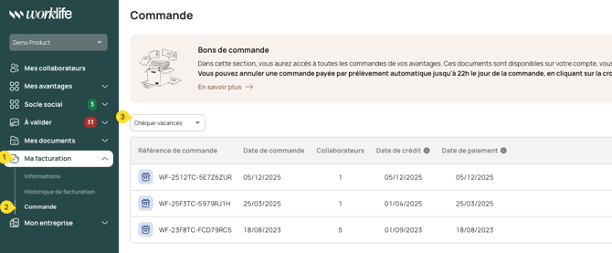Dans la section Ma facturation > Commandes, vous pouvez consulter l’ensemble des commandes liées aux avantages de vos collaborateurs. Tous les documents associés sont disponibles directement depuis votre compte et peuvent être téléchargés à tout moment.