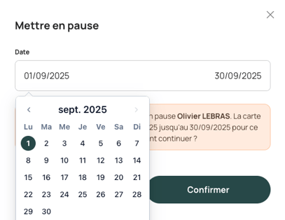 • Carte Worklife : la carte reste active mais inutilisable. Les transactions sont refusées avec le code not_allowed_in_pause.