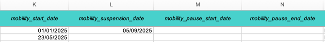 mobility_suspension_date→ Date de suspension de l’avantage. mobility_pause_stat_date→ Date de début de pause de l’avantage.- case à renseigner en cas de long arrêt maladie, congé parental etc.