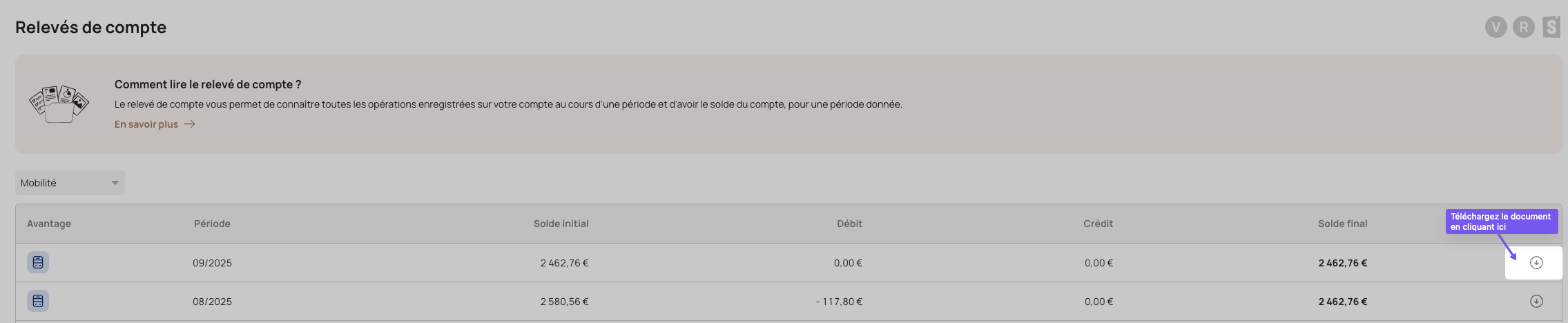 - 📥 Téléchargez votre relevé en cliquant sur la flèche à droite